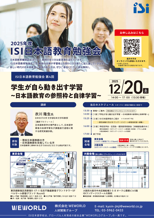 日本語教師はより広範な知識やスキルを身に付けることが求められているだけではなく、教師の役割や学習者との関わり方を新たな枠組みで捉え直す必要性に直面しています。2025年度のISI日本語教育勉強会は、「学生がやる気を出すシリーズ」と題し、「学生の学び」に教師がどう関わっていくのかを、皆様と一緒に具体化していきます。